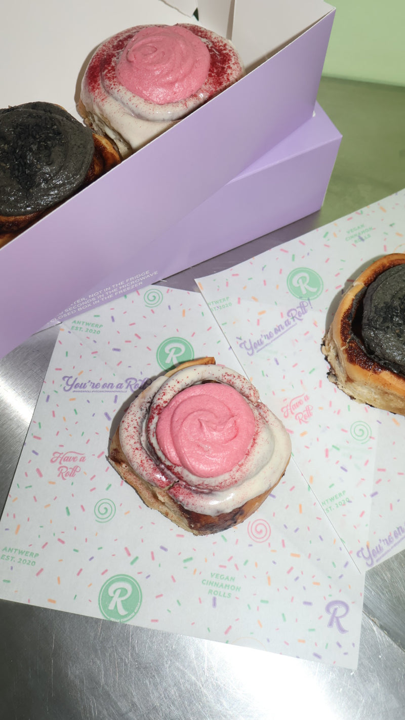 Try our White Chocolate Raspberry Roll, dipped in creamy white chocolate, topped with tangy raspberry frosting, and finished with a sprinkle of vibrant dried raspberry powder.